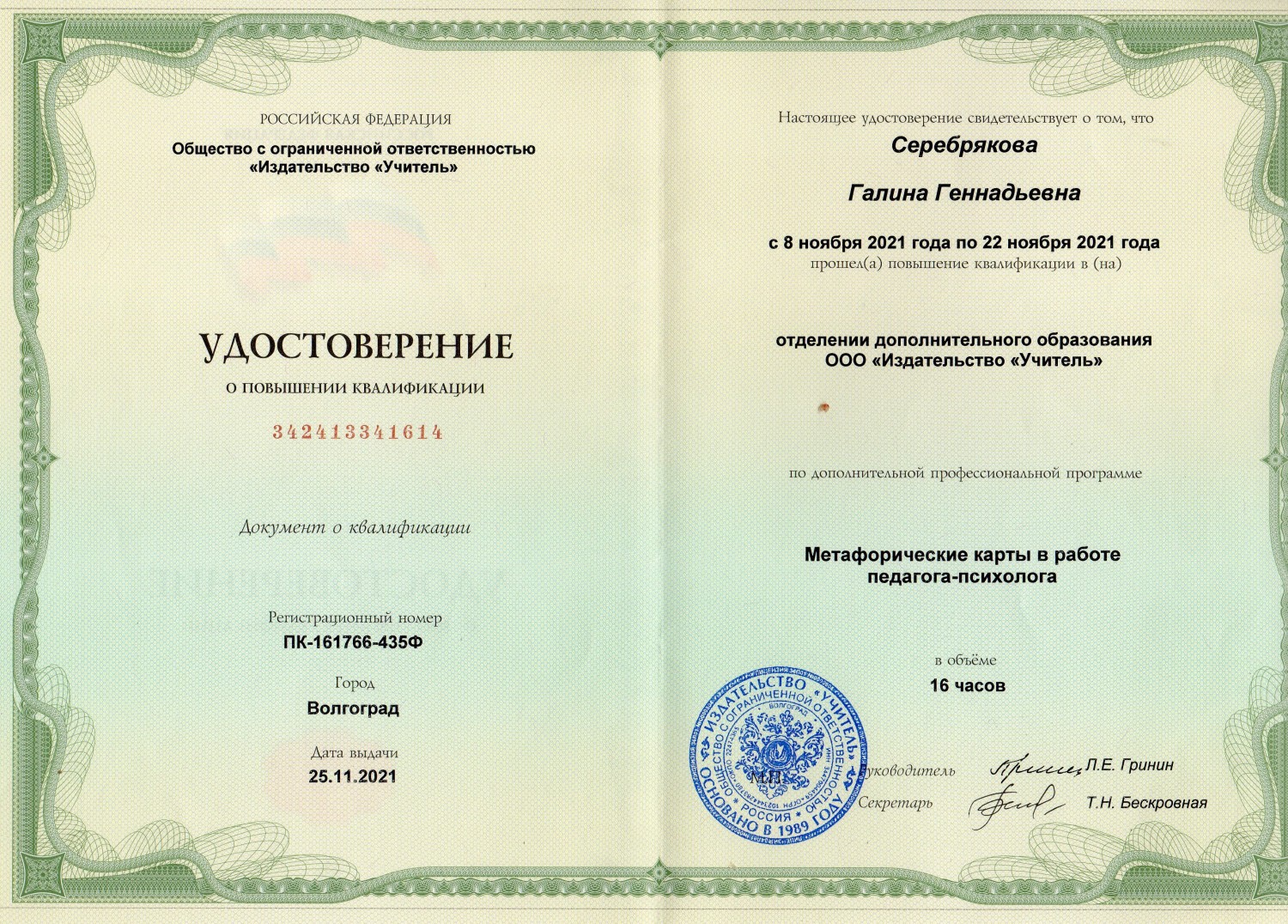 -2021 год, Общество с ограниченной ответственности "Издательство "Учитель" по дополнительной профессиональной программе "Метафорические карты в работе педагога-психолога"