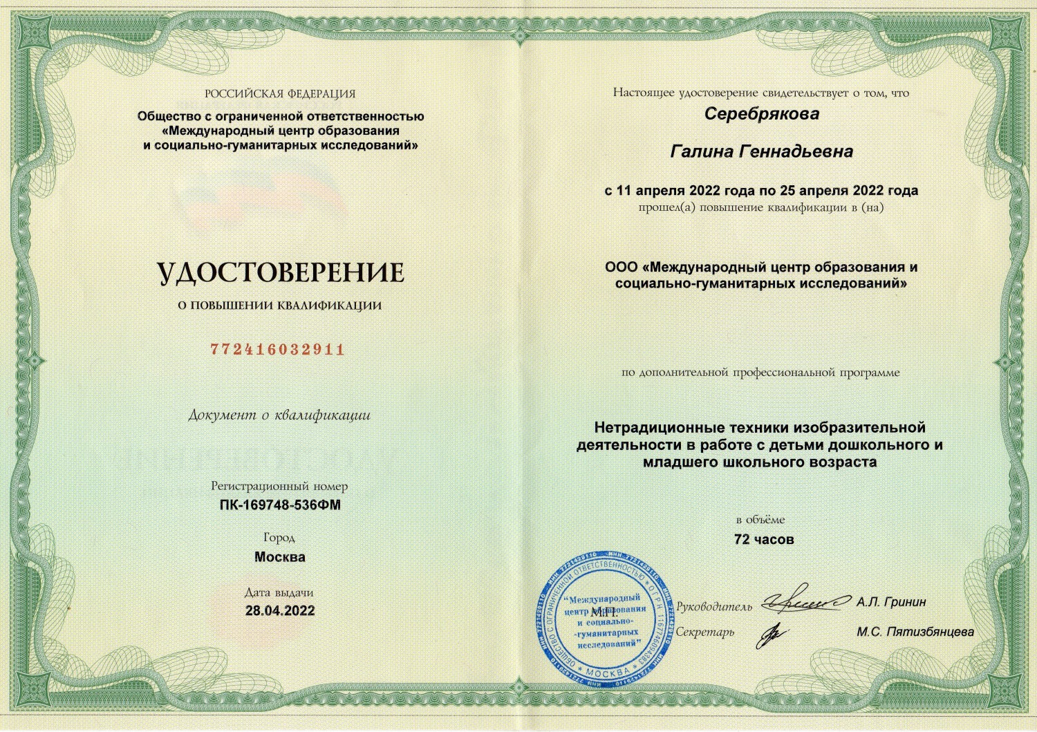 -2022 год,Общество с ограниченной ответственностью "Международный центр образования и социально-гуманитарных исследований" по дополнительной образовательной программе "Нетрадиционные техники изобразительной деятельности в работе с детьми дошкольного и младшего школьного возраста"