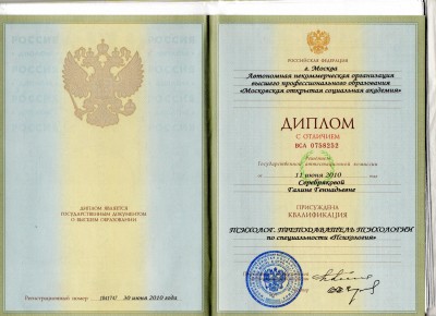 - высшее, 2010 год, г. Москва, Автономная некоммерческая организация высшего профессионального образования "Московская открытая социальная академия", квалификация "Психолог.Преподаватель психологии" по специальности "Психология"