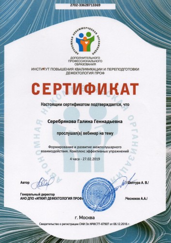 -2019 год,"Институт повышения квалификации и переподготовки дефектология проф" Вебинар на тему "Формирование и развитие межполушарного взаимодействия. Комплекс эффективных упражнений."