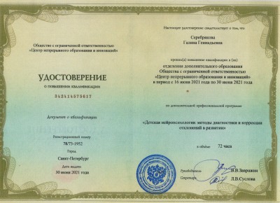 -2021 год, Общество с ограниченной ответственностью "Центр непрерывного образования и инноваций" по дополнительной образовательной программе "Детская нейропсихология: методы диагностики и коррекции отклонений в развитии" - 72 часа.